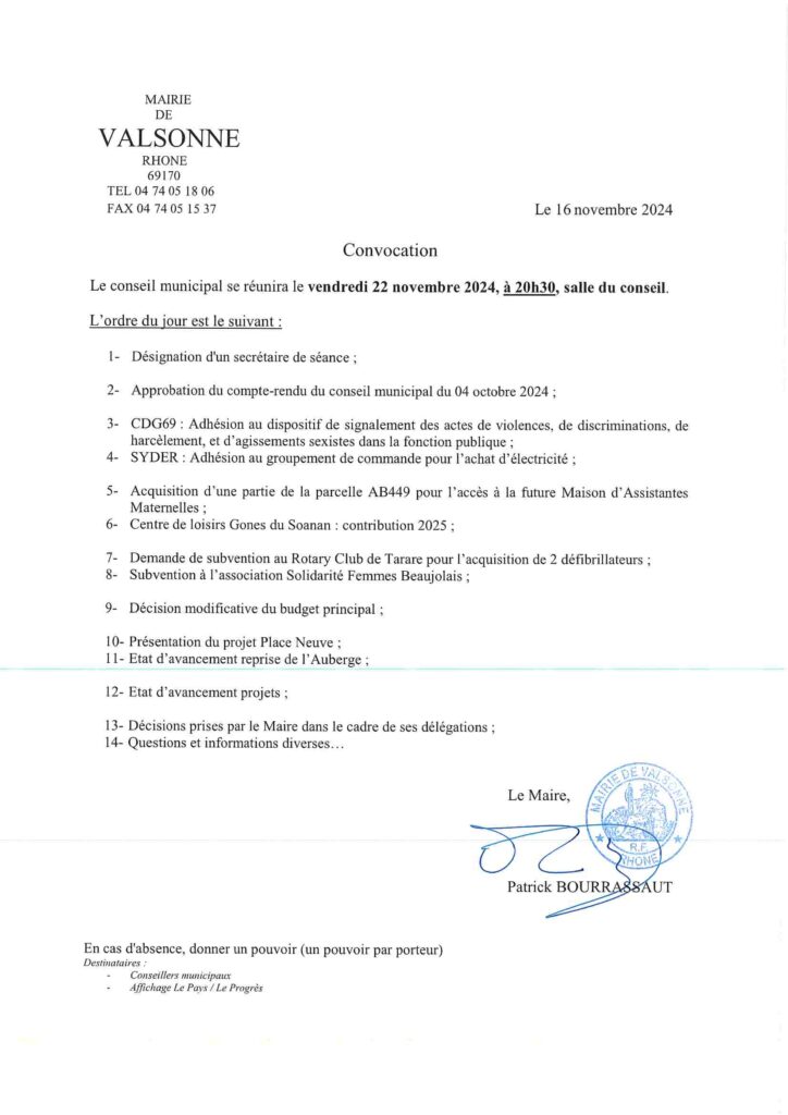 Le Conseil Municipal se réunira le vendredi 22 novembre 2024 à 20h30, salle du conseil.