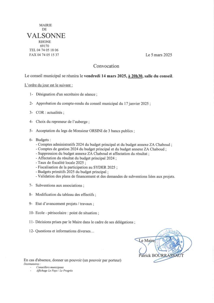 Le conseil municipal se réunira le vendredi 14 mars 2025, à 20h30, salle du conseil.