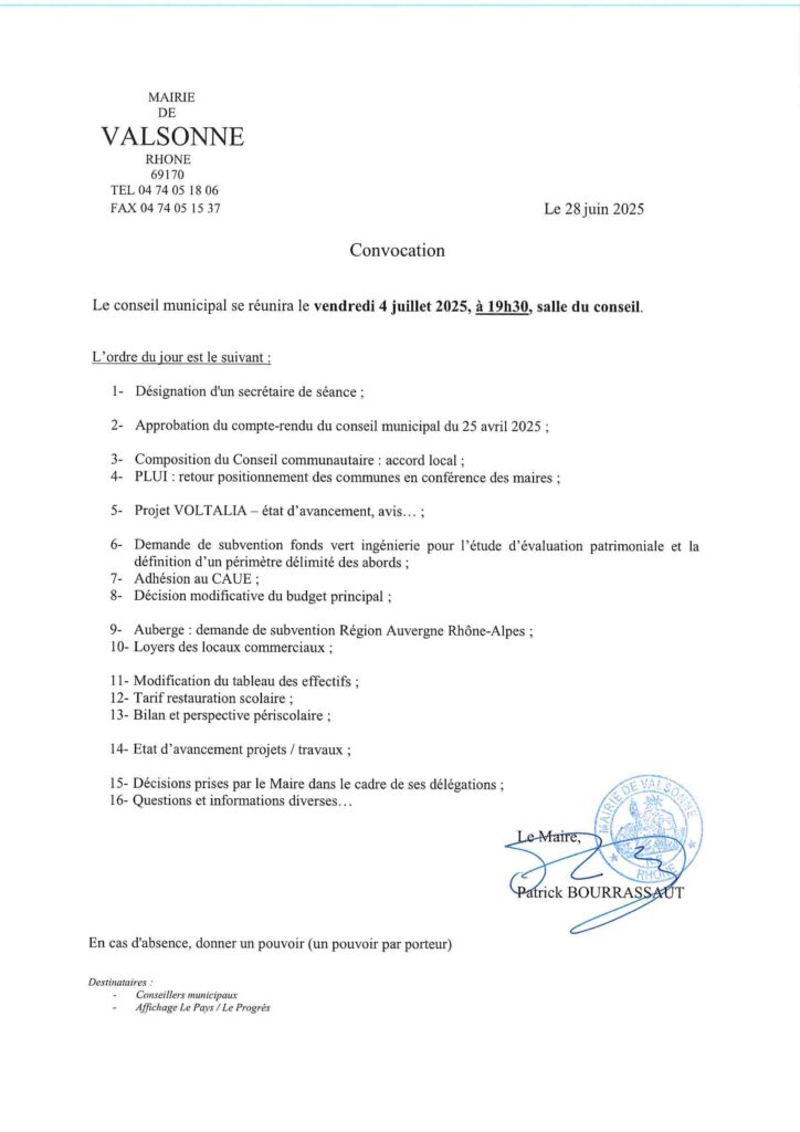Le conseil municipal se réunira le vendredi 4 juillet 2025 à 19h30, salle du conseil.