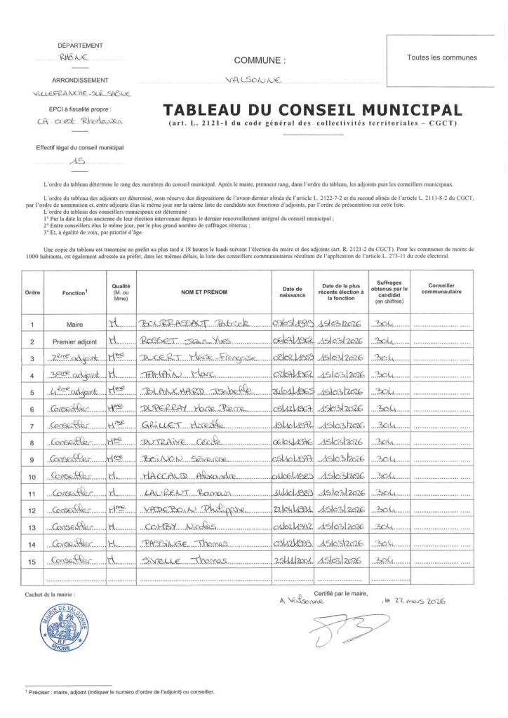 Suite aux élections municipales du 15 mars 2026, le tableau du Conseil Municipal est disponible.